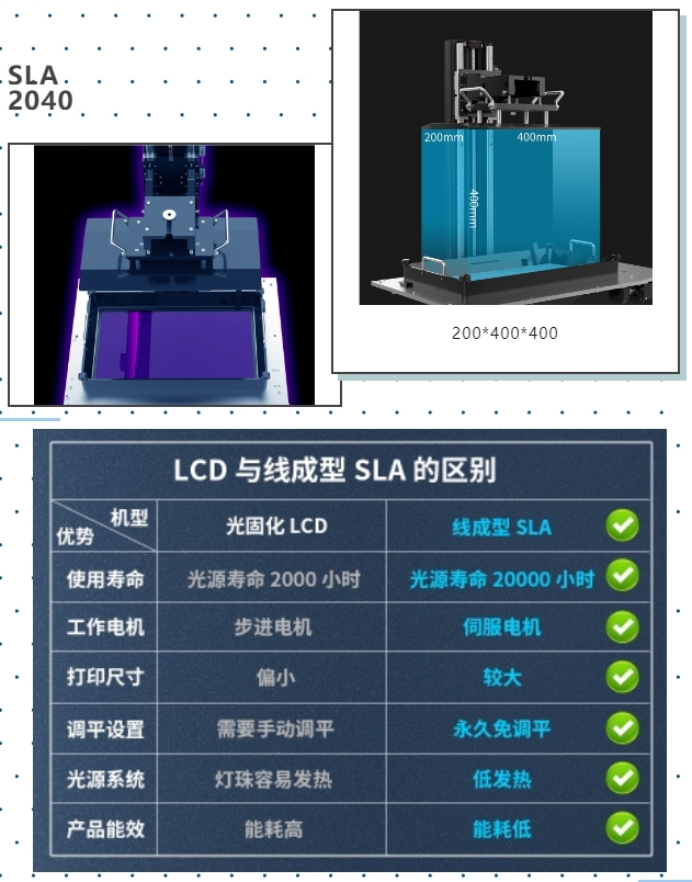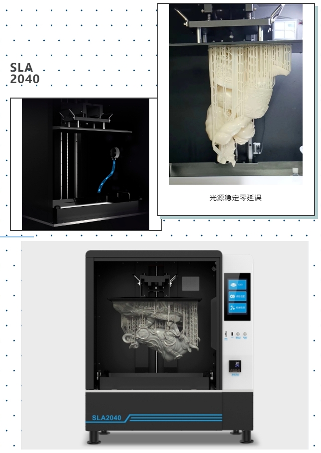 與同尺寸SLA線成型3D打印機相比,2040采用專業(yè)團(tuán)隊研發(fā)的大尺寸光機,光源穩(wěn)定,接觸樹脂零延誤,光源掃描范圍可立即固化。