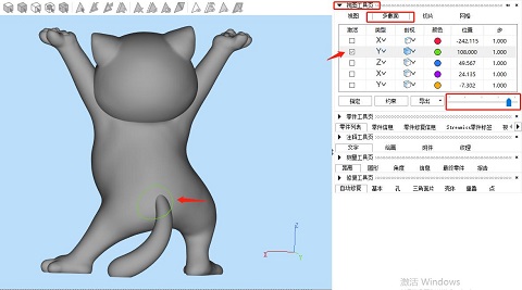 ②在左側(cè)視圖工具頁,選擇“多截面”,類型中即指不同方向軸的截面,當(dāng)然我們也可以點(diǎn)擊展開后自行選擇別的截面,如3點(diǎn)確定一個(gè)別的角度的截面。勾選激活某個(gè)截面后,拉動下方的移動軸即可控制模型上的截面的移動。同時(shí)我們也可以在“剖視”欄選擇不同的視圖效果,把截面移動至自己需要切割的位置。