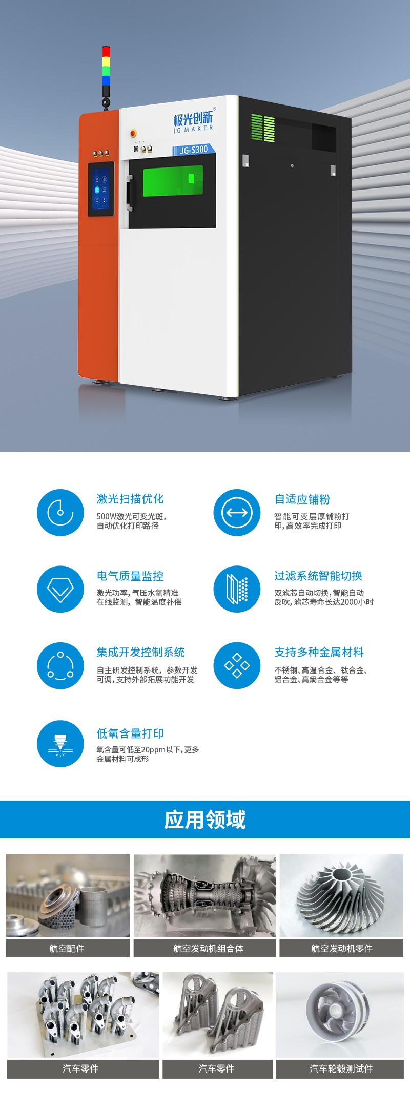 同時,作為3D打印行業(yè)的頭部企業(yè),極光創(chuàng)新一直緊跟市場步伐,積極研發(fā)出更適合市場需求的3D打印產(chǎn)品,日前推出的全新工業(yè)級金屬3D打印設(shè)備JG-S300,可以全方位滿足工業(yè)市場各領(lǐng)域用戶的需求,助力企業(yè)加快市場研發(fā)效率、降本增效的同時,不斷提升市場的占有率。