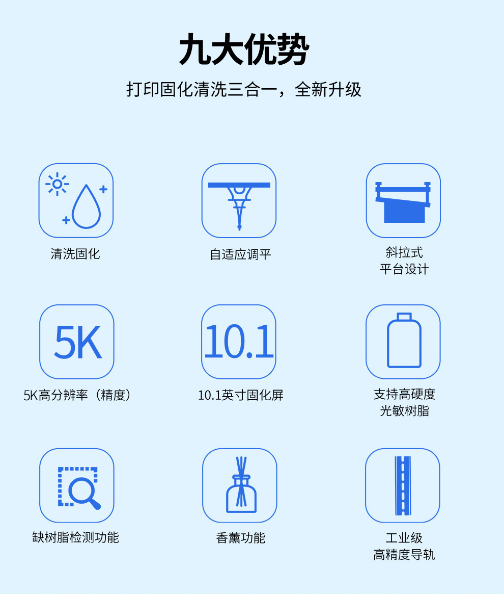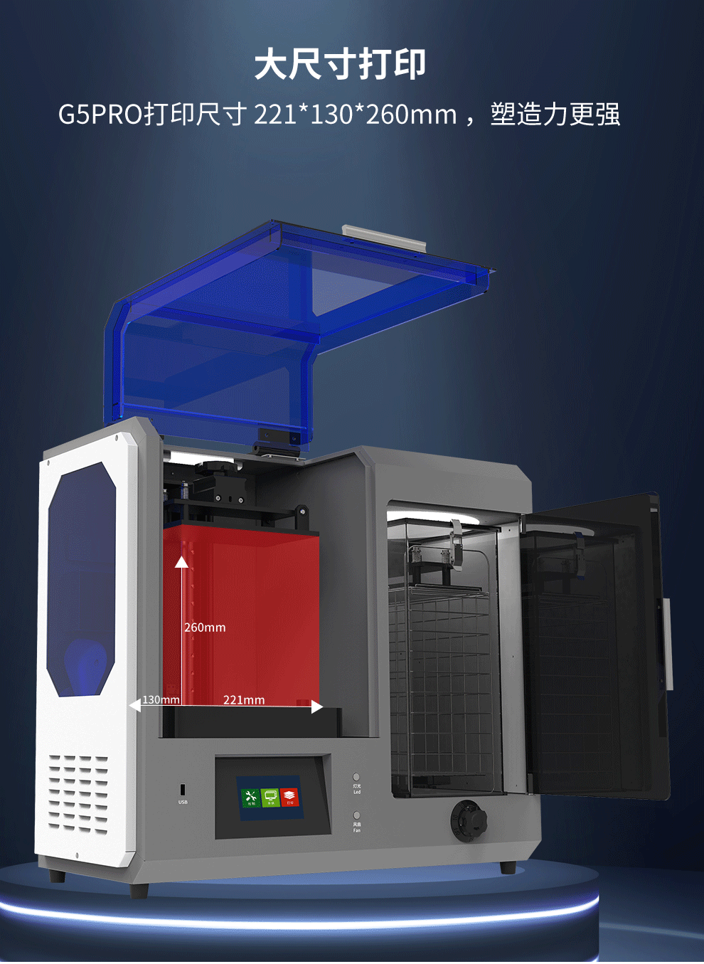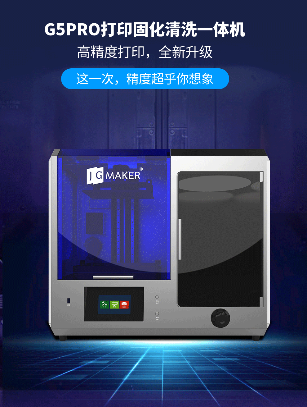 JG-L5 Pro 采用10.1寸6K透光固化屏,理論精度可高達0.045mm;增加打印、清洗、固化 三合一功能,內置攝像監控;對斷料檢測傳感器模塊做了升級,以及缺料會自動提示加料。