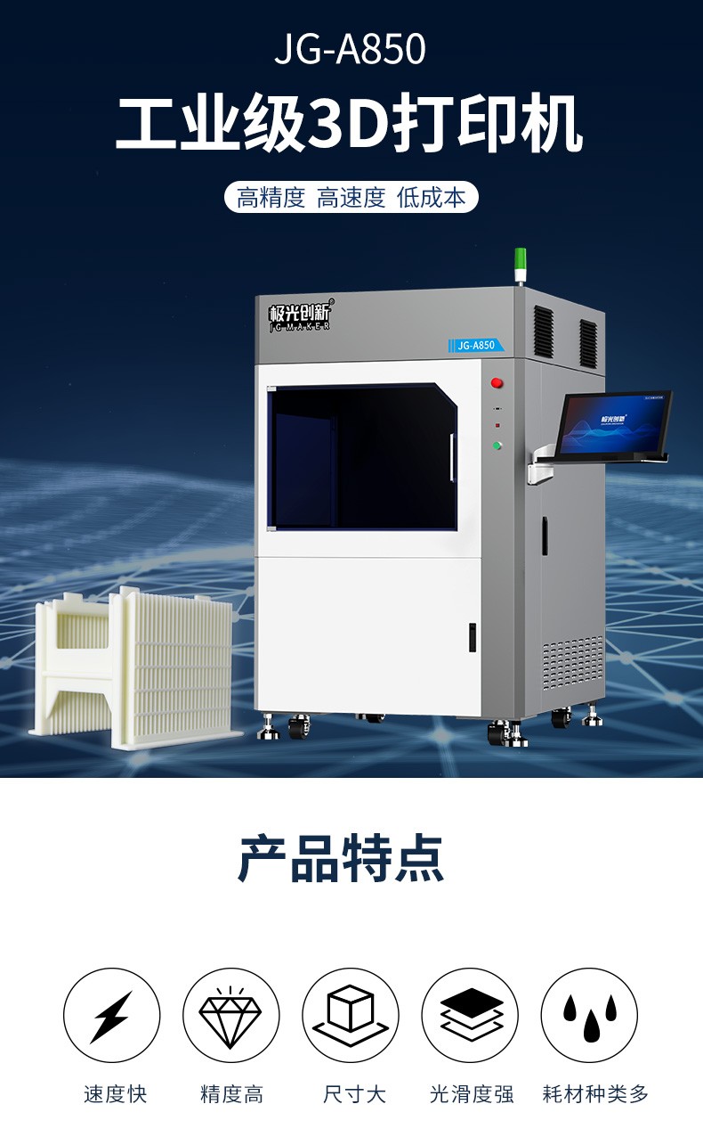 JG-A850 是極光創(chuàng)新自主研發(fā)生產(chǎn)的大尺寸工業(yè)級(jí)3D打印機(jī),擁有800*800*500mm的成型尺寸,可以快速成批量的制做精密零件和組裝件。